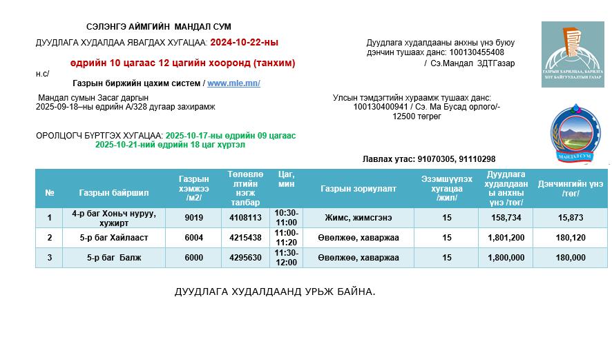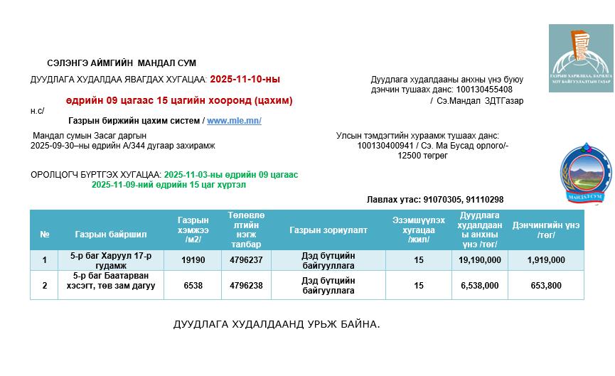 ГАЗАР ЭЗЭМШИХ ЭРХИЙН ДУУДЛАГА ХУДАЛДААНД УРЬЖ БАЙНА.