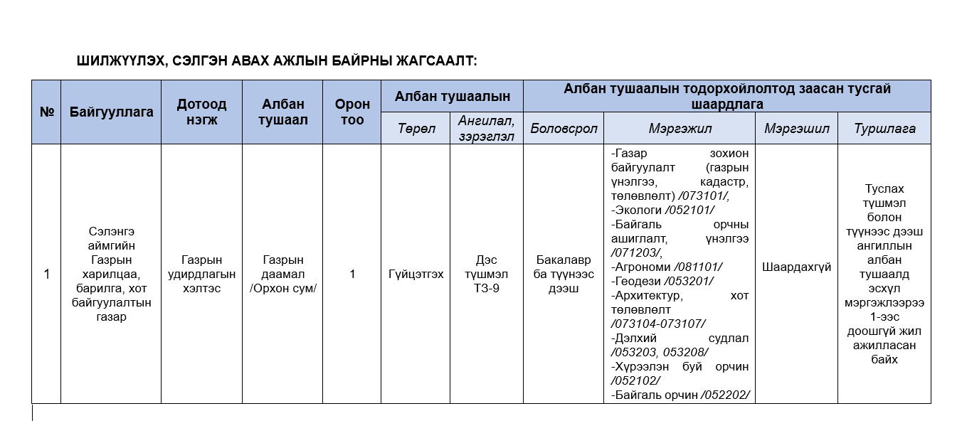 Төрийн албаны зөвлөлийн 2023 оны 25 дугаар тогтоолоор батлагдсан Төрийн албаны шалгалт өгөх болзол болон шатлан дэвшүүлэх, сонгон шалгаруулах журмын 4 дүгээр зүйлийн 4.2-т заасны дагуу төрийн өөр байгууллага, нэгж хооронд шилжин ажиллахыг хүссэн төрийн холбогдох бусад байгууллагад ажиллаж байгаа төрийн жинхэнэ албан хаагчдыг дараах албан тушаалд холбогдох материалаа цахим шуудангаар ирүүлэхийг урьж байна.