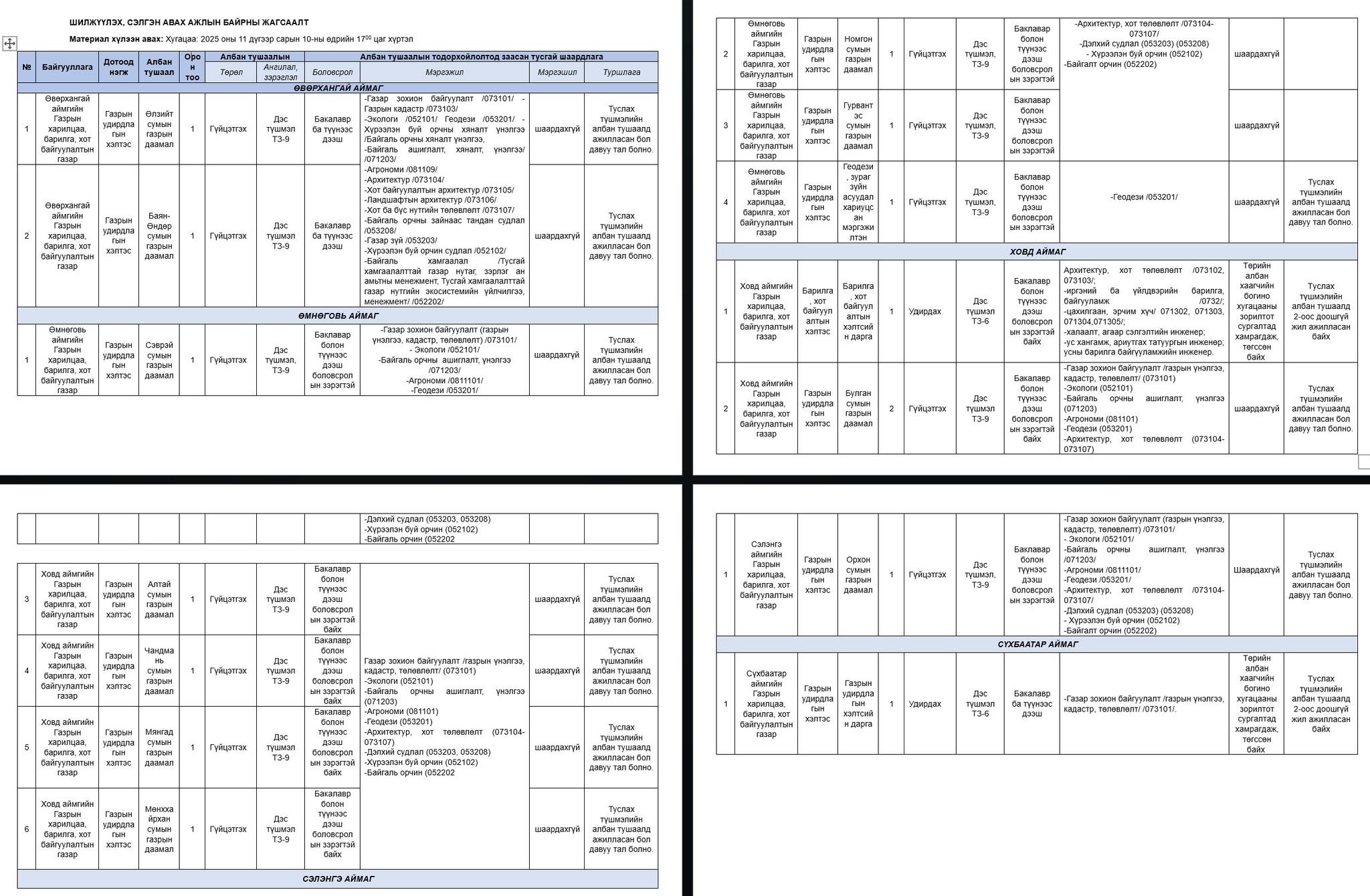 Шилжин ажиллах боломжтой албан тушаалын жагсаалттай дараах холбоосоор орж танилцана уу.